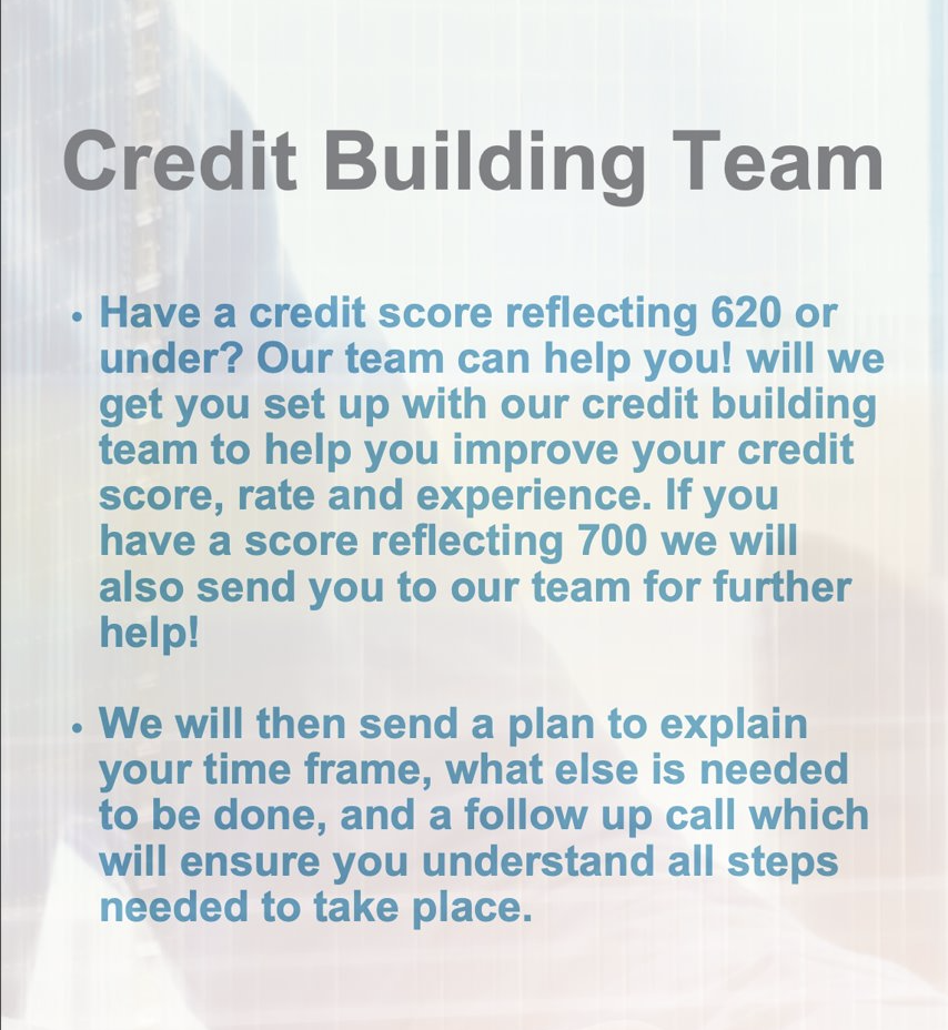 If your credit score needs work, our team can help create a plan to improve it. We’ll guide you step by step, provide timelines, and follow up to ensure you’re on track. Whether building from 620 or aiming for 700+, we’re here to support your journey.