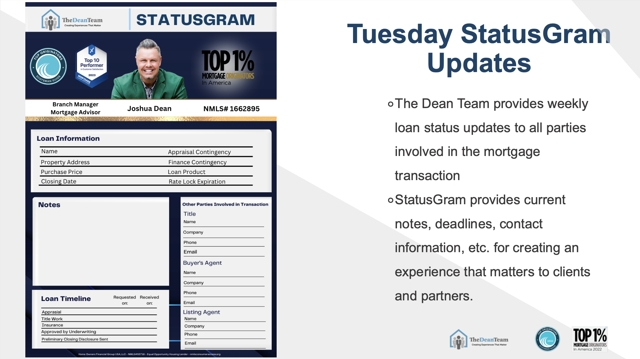 The biggest complaint in the industry is a lack of communication from loan officers. We cut that off at the knees by providing an loan status update to the client and agents every Tuesday.