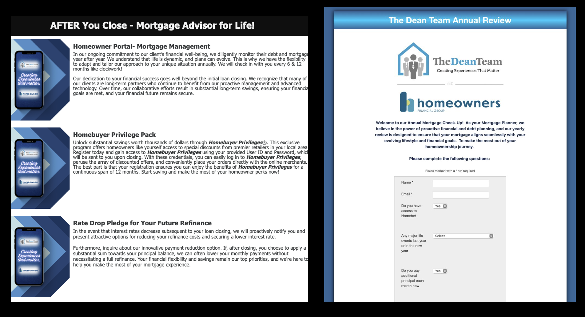 We keep in contact with our clients in a number of ways. We have our home management portal, Homebuyer privilege pack, rate drop pledge, and we reach back out yearly for their annual review!